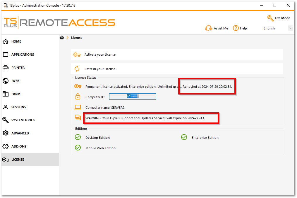 Before migrating your server, update your TSplus version. (Requires a support subscription)
