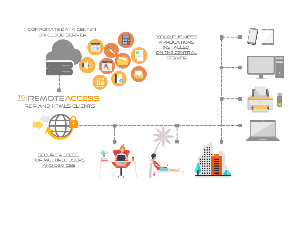 With TSplus, offices manage to better security, optimize app control, and scale down IT overheads. TSplus RDP by TSplus will provide virtual Windows desktops and any of the applications the employees need, in agreement with the company’s requirements, to any type of device.